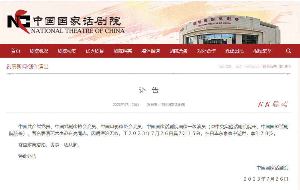 7月26日,中国国家话剧院发布讣告: