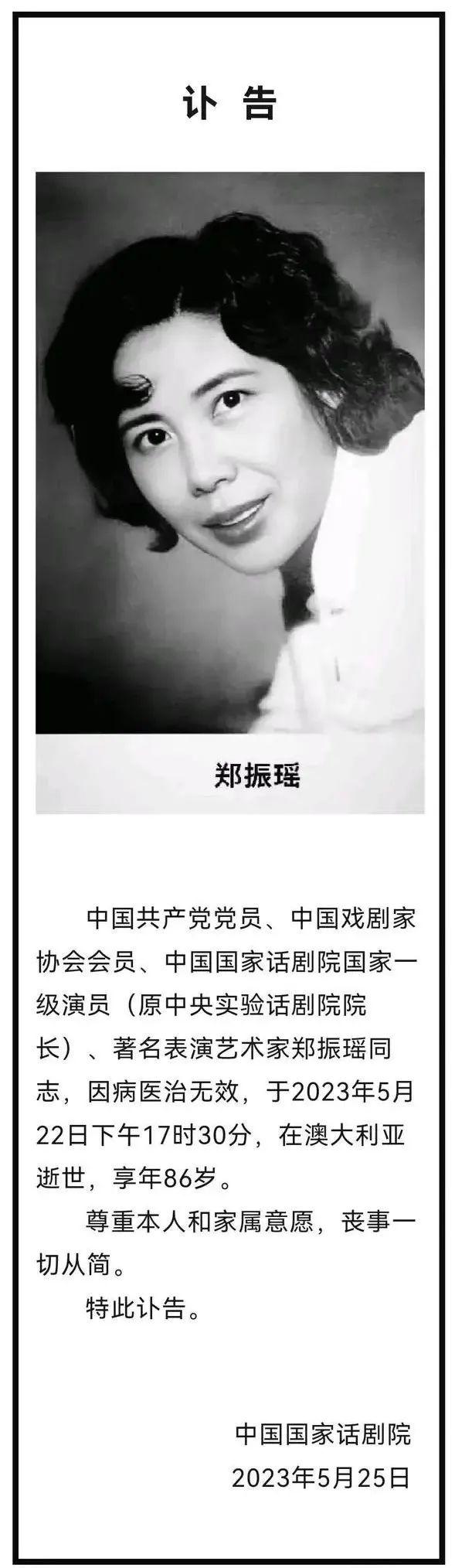 中国共产党党员、中国戏剧家协会会员、中国国家话剧院国家一级演员(原中央实验话剧院院长)、著名表演艺术家郑振瑶同志,因病医治无效,于2023年5月22日下午17时30分,在澳大利亚逝世,享年86岁。