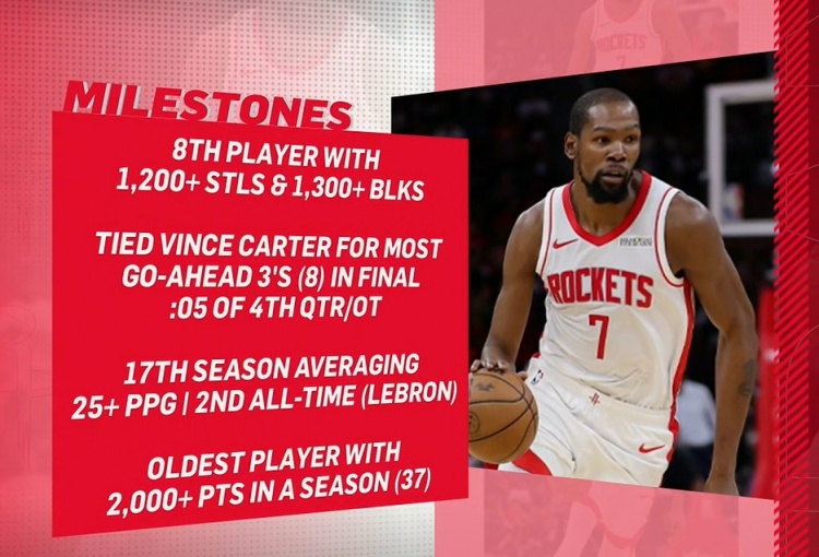 天天盈球-KD本季里程碑:历史最老单季2000分先生 生涯17次单季25+仅次老詹
