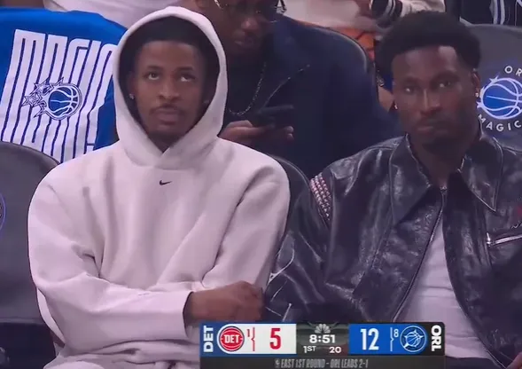 转播镜头给出一个画面:莫兰特和小贾伦今日在魔术主场,观看贝恩的比赛。